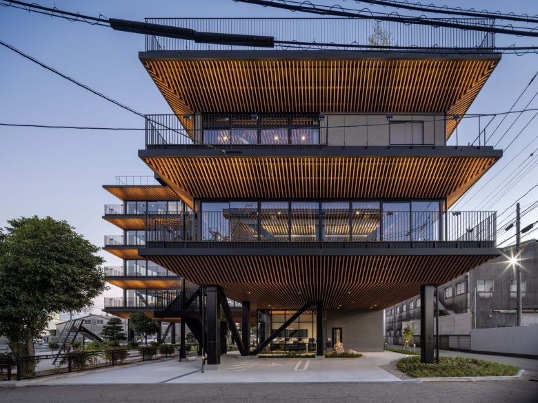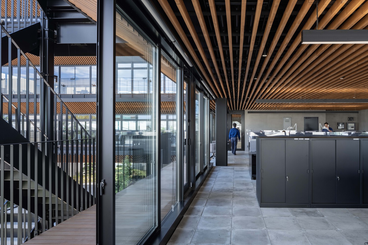 The structure is steel-framed, with a full-glass façade and wrap-around balconies that serve as both refreshment areas and environmental buffers. Pinewood louver ceilings extend seamlessly from the interior to the exterior eaves, concealing mechanical equipment while creating a warm atmosphere like being under tree cover. Their shadows recall the underside of traditional shrine roofs, and at night, deck lighting highlights the wood pattern. Louvers on the piloti ceiling evoke the hulls of kitamae trading boats.