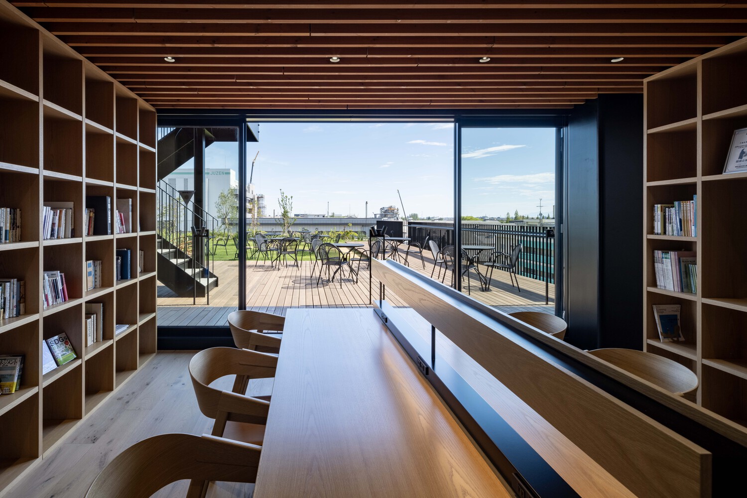 Juzen Chemical Corporation, founded in 1950 in Toyama City, is a contract manufacturer of active pharmaceutical ingredients. Situated between the Jintsu River and the Fugan Canal within an industrial park, the company decided to consolidate its dispersed offices, meeting rooms, and cafeteria into a new headquarters. The new building not only addresses operational efficiency but also reflects Toyama’s natural environment and cultural heritage, while offering a workplace that enhances employee well-being and connects with the surrounding community.