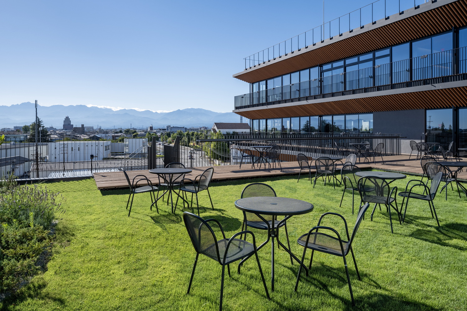 Landscaping beneath the raised floors includes medicinal herbs and local trees, irrigated by underground alpine water that also serves for snow melting. These green areas connect directly to the neighboring park, inviting employees, residents, and visitors alike to enjoy the space. Balconies and terraces allow passive climate control by shading summer sun, admitting low winter light, and enabling natural ventilation with prevailing breezes. Beyond efficiency, the design provides a workplace that embodies Toyama’s landscape and culture, offering an environment for collaboration, resilience, and community engagement.