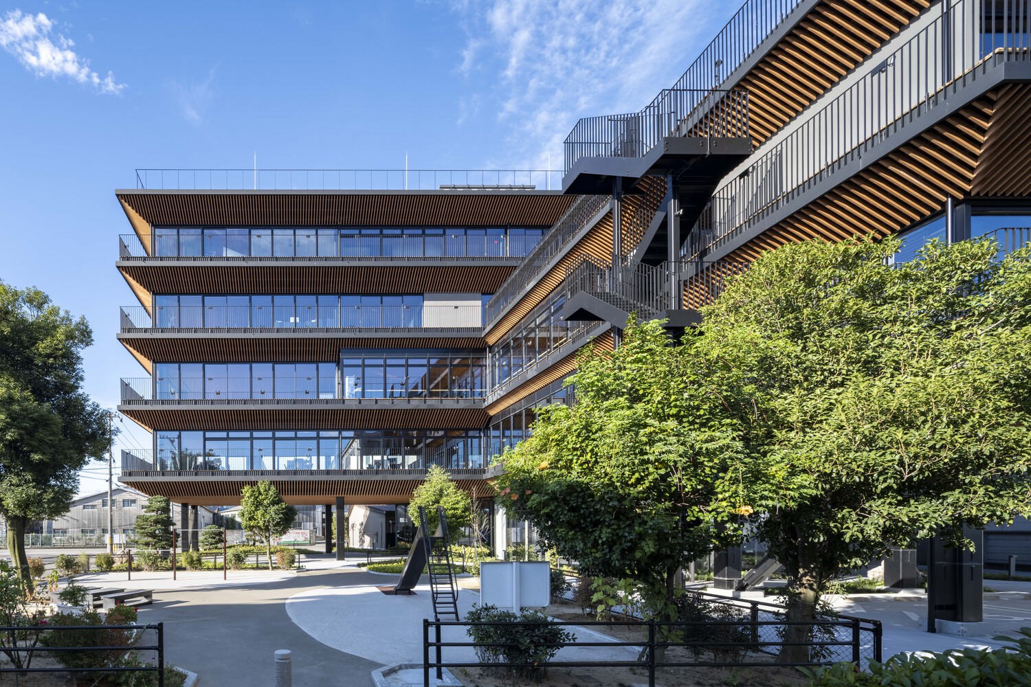 The site presented both challenges and opportunities. A private residence and a small park occupy two corners of the block. To avoid overshadowing the neighboring home and to maintain morning sunlight, the southern façade was designed as a flat plane. This decision produced an L-shaped volume that embraces the adjacent park, transforming it into part of the workplace experience. At the same time, the site lies within the Jintsu River floodplain, requiring that principal office functions be elevated above ground level for flood resilience.
