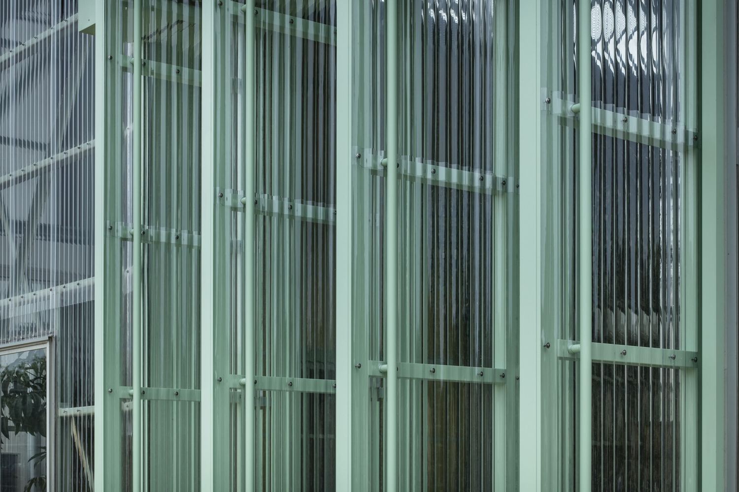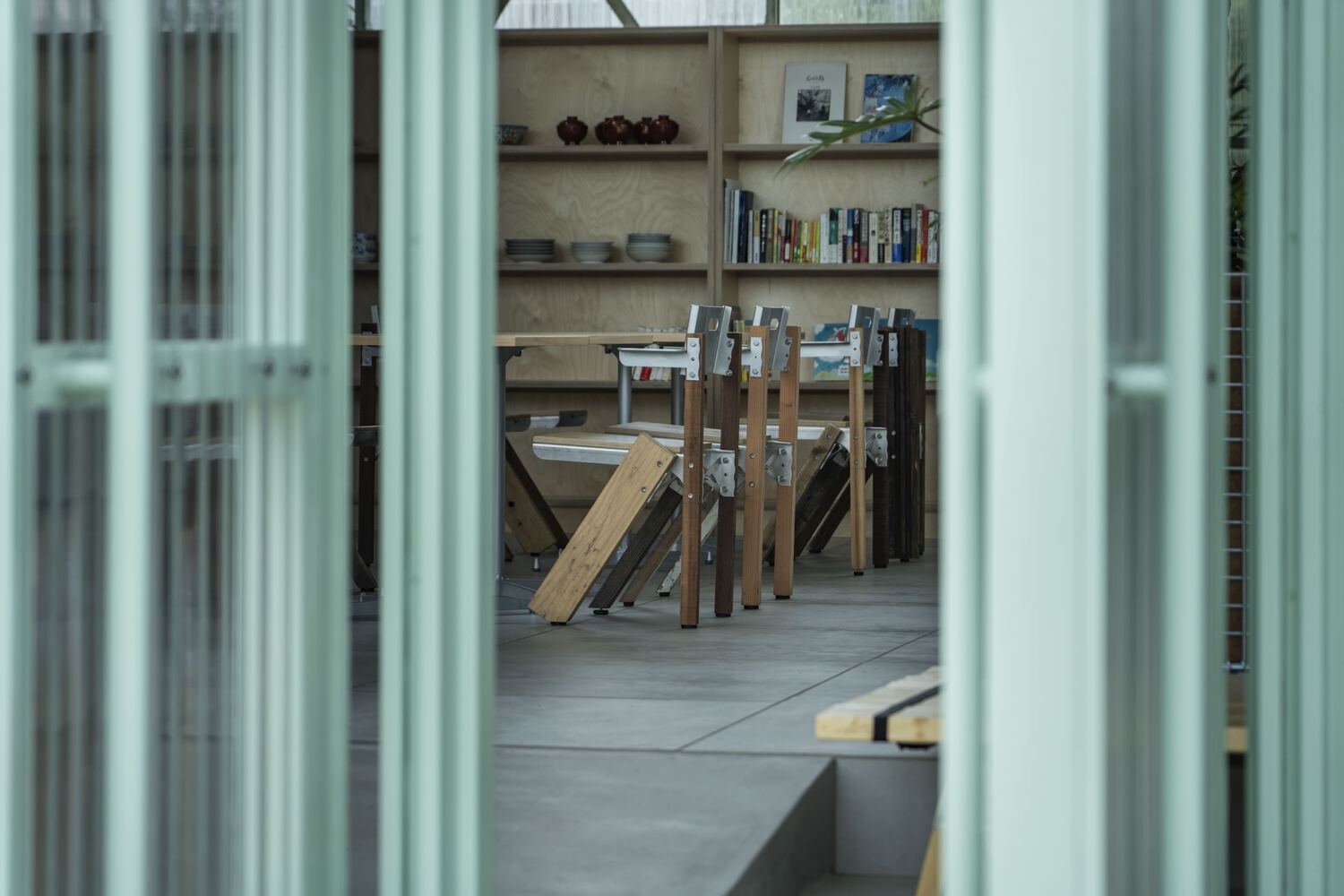 In terms of architectural planning, the original factory building, with a total floor area of 360 m², was divided into two roughly equal parts. One part retained its function as a factory and was becoming a brewery, while the other half was converted into a new cafeteria with a floor area of less than 200 m². The existing building had a large symmetrical entrance at its centre, so the design was organised around this axis. The factory side retained the existing slate roof to ensure shade, while the cafeteria side used corrugated polycarbonate panels to allow natural light to enter. As a result, the twin-like spaces appeared at the entrance to Teshima.