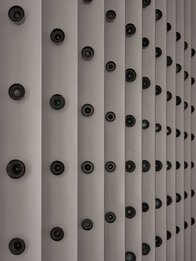 Stepping into the product experience zone, a monumental lens wall rises from floor to ceiling, presenting generations of SIGMA lenses in disciplined order. ONOAA STUDIO developed a triangular column system, studying the mounting mechanisms and specifications across product lines, and custom-molded select fixtures to achieve the wall’s precise display. Beneath it stands a circular island table. Its base is a single block of limestone marked by fossils and weathered traces—compressed and eroded over time—capturing a moment that visitors instinctively record with their eyes.