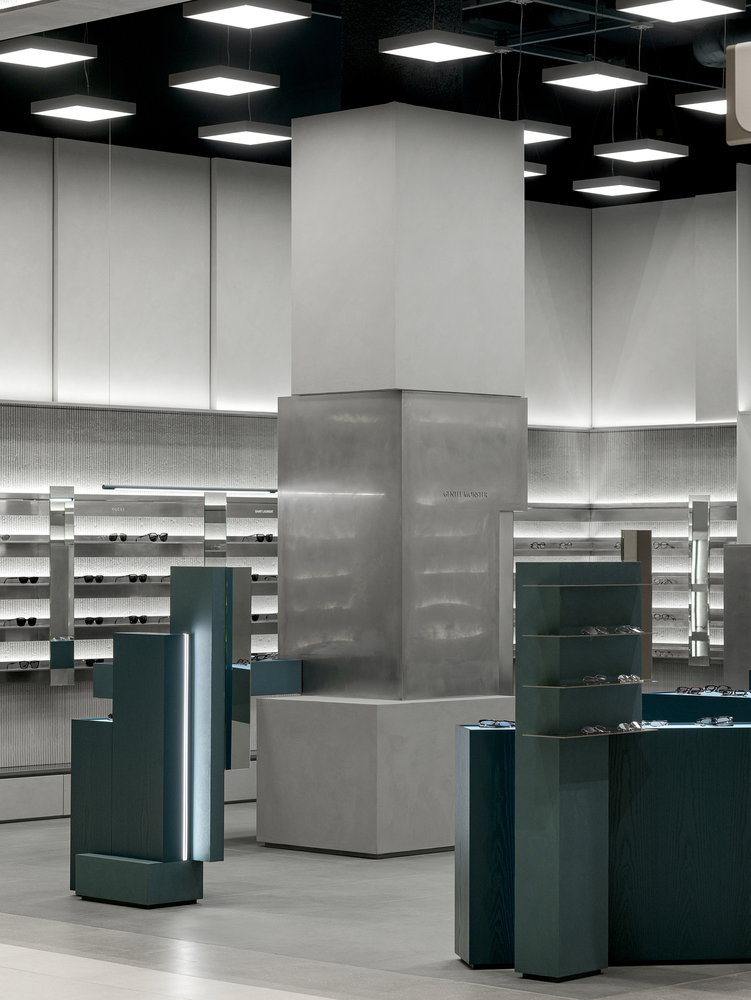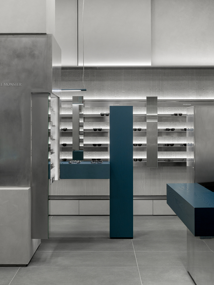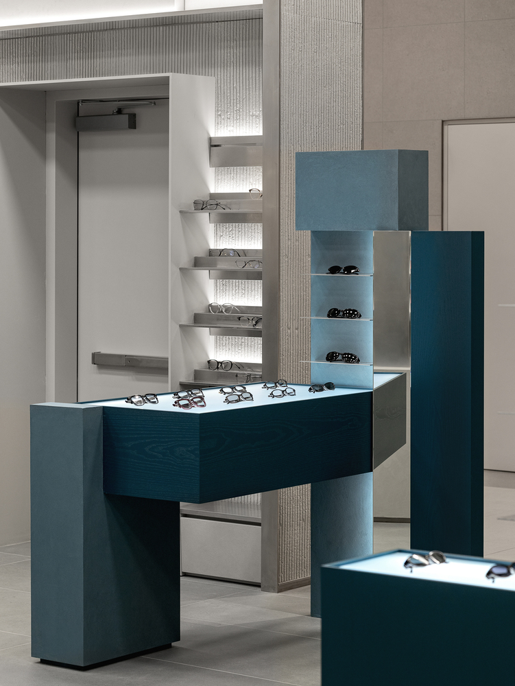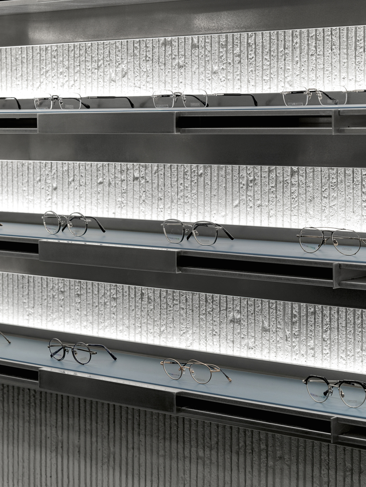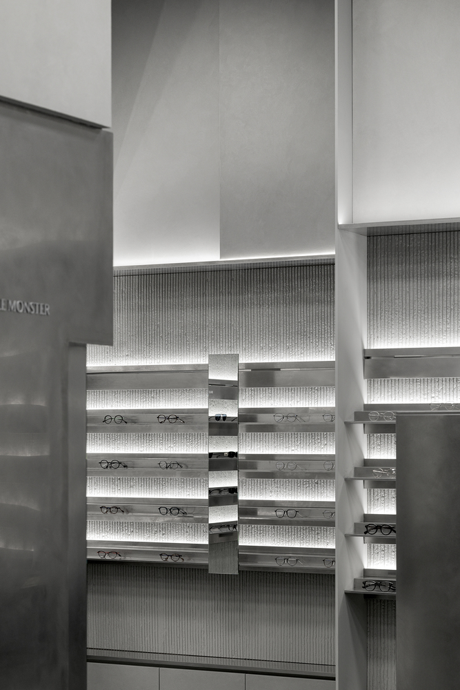 Like walking through fog or seeking clarity within blurred sight, clusters of masses are dispersed at the center of the space. Visitors move between these masses, discovering products that suit them, trying them on, lingering, and exploring the space. The central masses interlock in subtly misaligned ways, reflecting the ambiguous nature of fog—less stable and more imperfect in form—while each mass is expressed differently. This irregular spatial language extends to the wall surfaces, adding depth and dimensionality through material treatment.