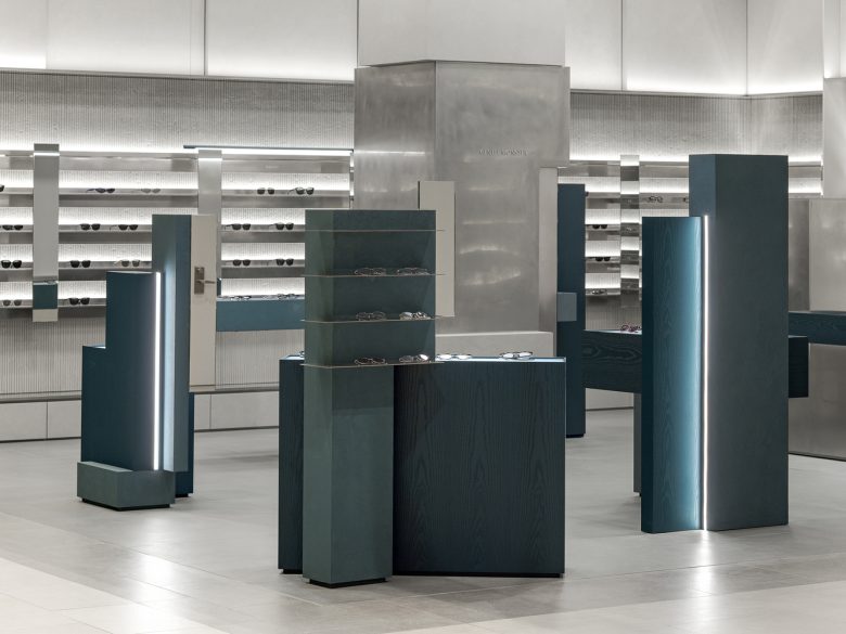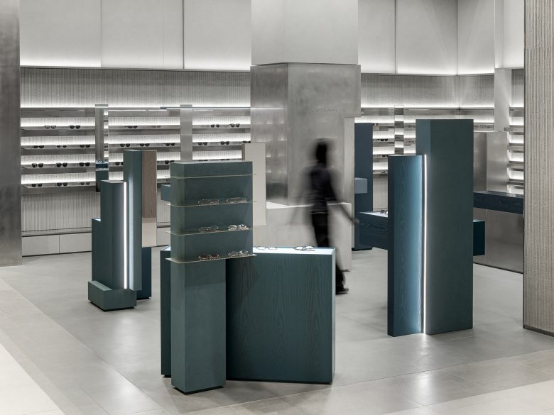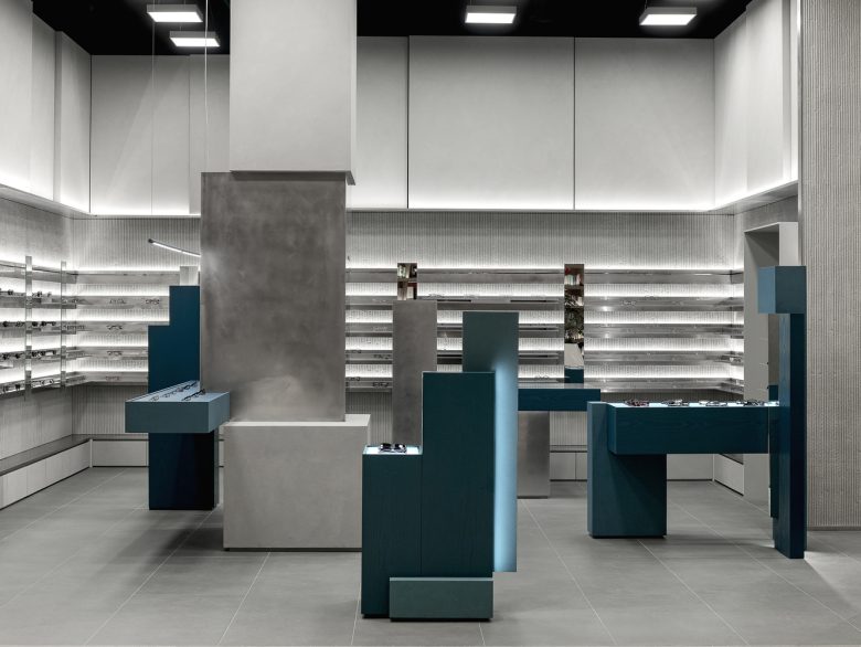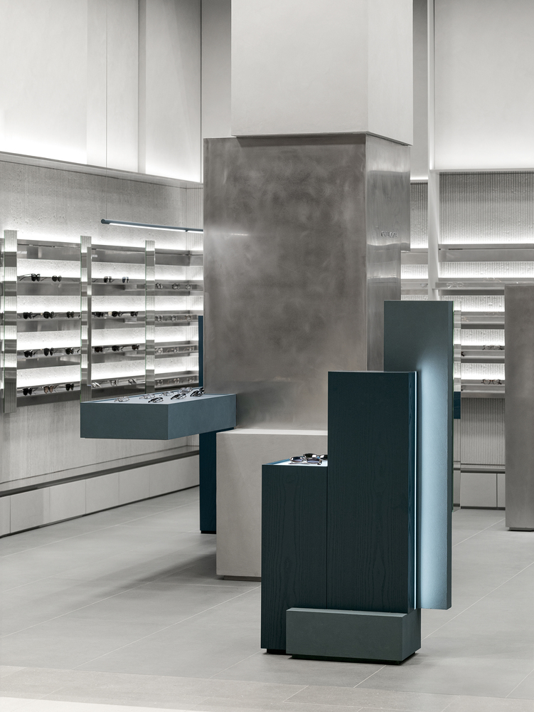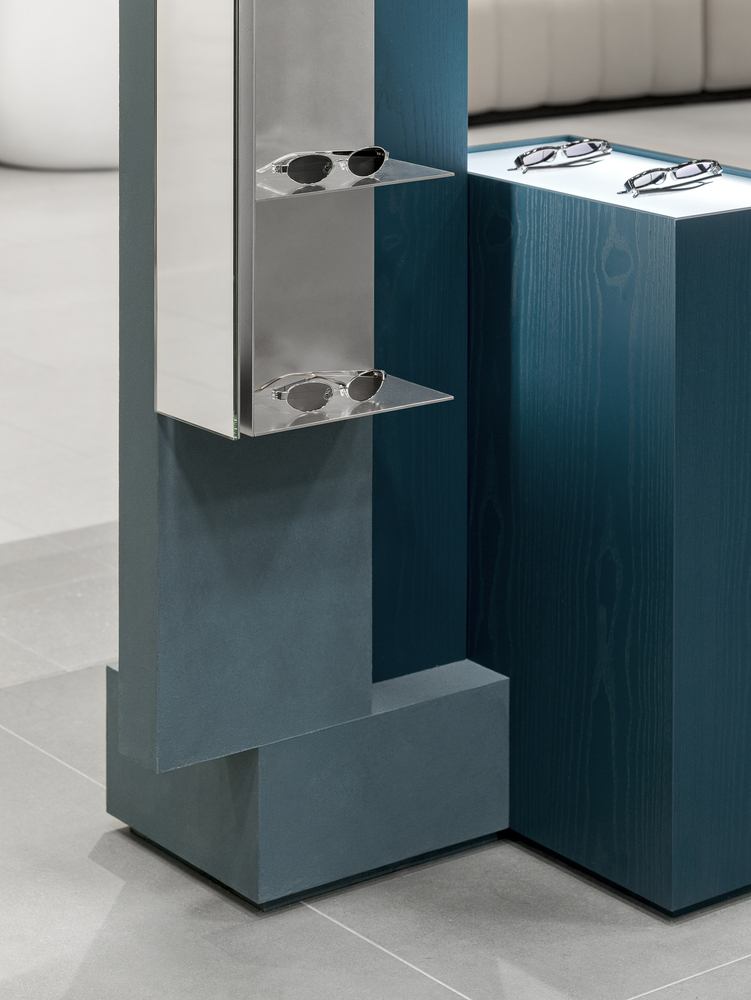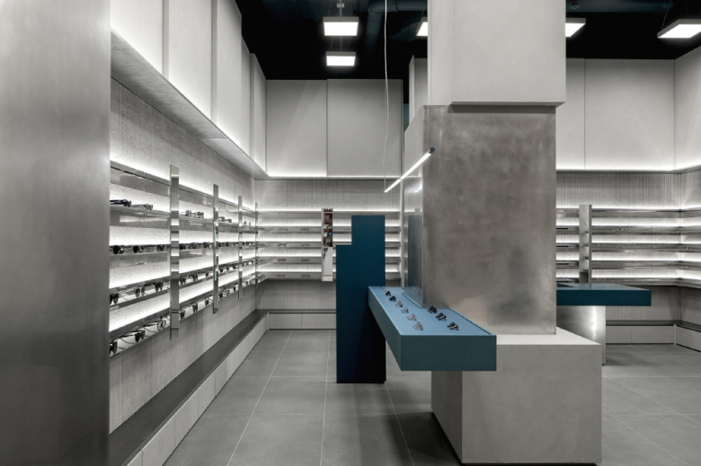 Like walking through fog or seeking clarity within blurred sight, clusters of masses are dispersed at the center of the space. Visitors move between these masses, discovering products that suit them, trying them on, lingering, and exploring the space. The central masses interlock in subtly misaligned ways, reflecting the ambiguous nature of fog—less stable and more imperfect in form—while each mass is expressed differently. This irregular spatial language extends to the wall surfaces, adding depth and dimensionality through material treatment.