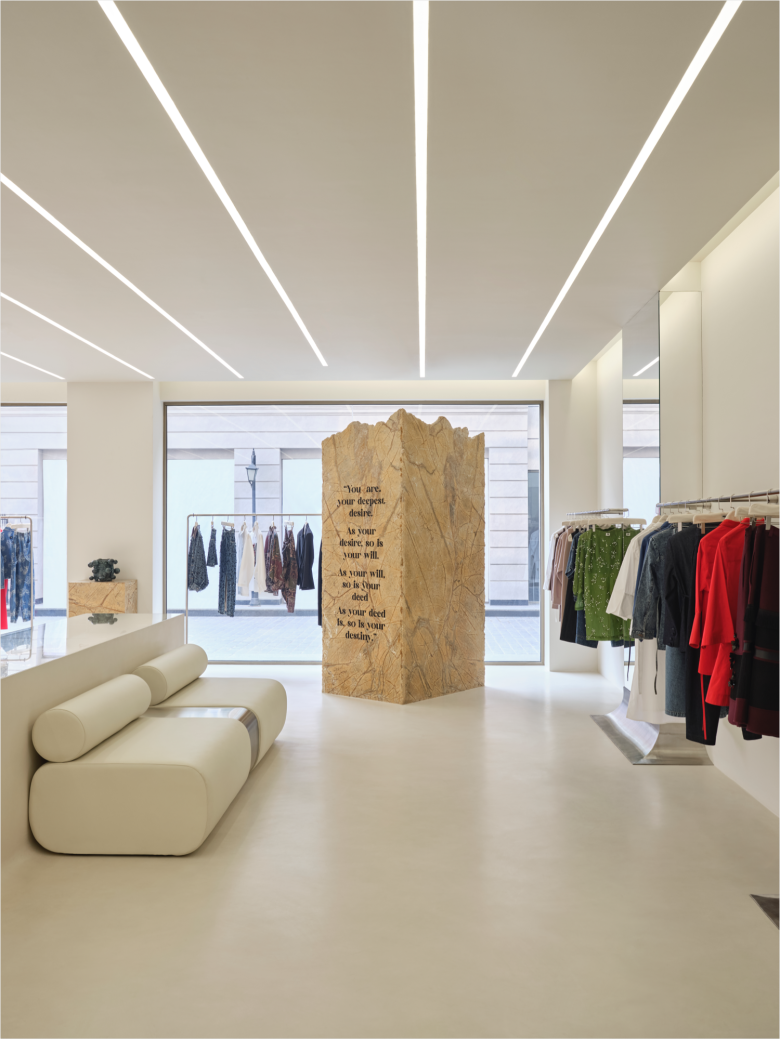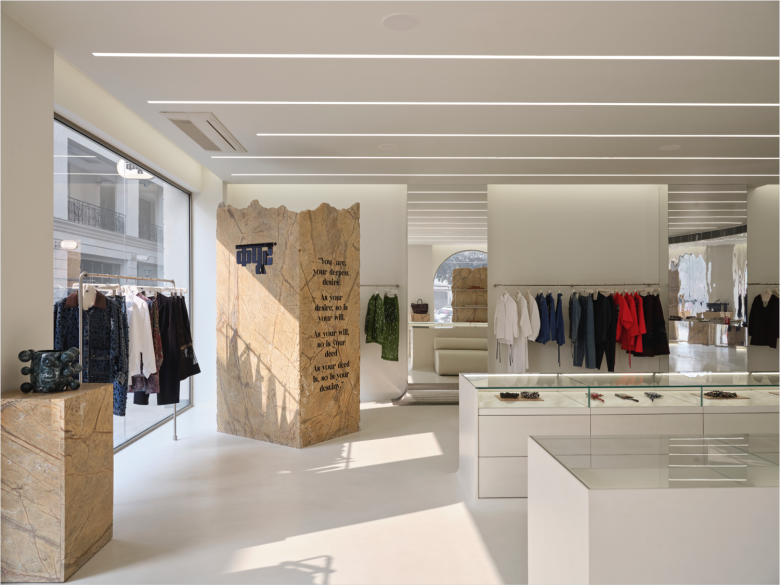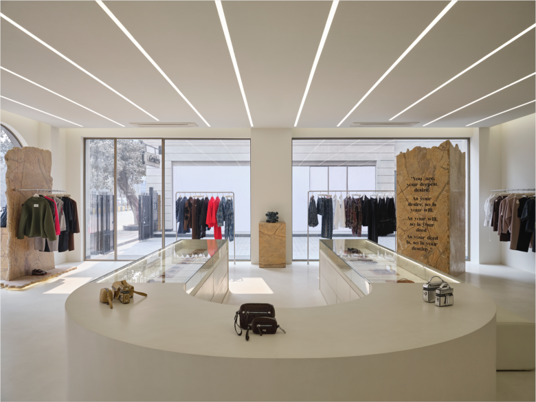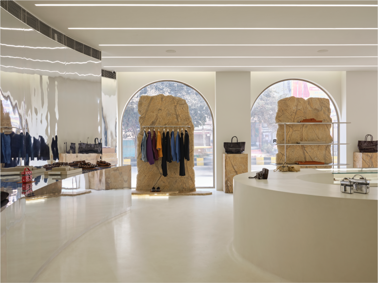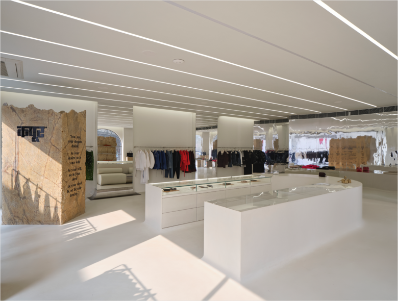 The back sees recessed display nooks interspersed with floor-to-ceiling mirrors. A low upholstered bench, obviously in matching white, sits right beside the eye-catching counter. White concrete flooring ties in all the different shop sections, while overhead, rows of embedded linear ceiling lights add a visual dynamic element to the setting. And that’s not all further elevating the shopping experience is a custom-developed scent and a carefully calibrated soundscape. The chosen design codes extrapolate the designer’s ongoing dialogue between past and future, and this is also supported by a palette of elemental materials and soft monumental forms. The new Dhruv Kapoor flagship store carries the full range of women’s and men’s apparel, bags and special projects products. © superfuture