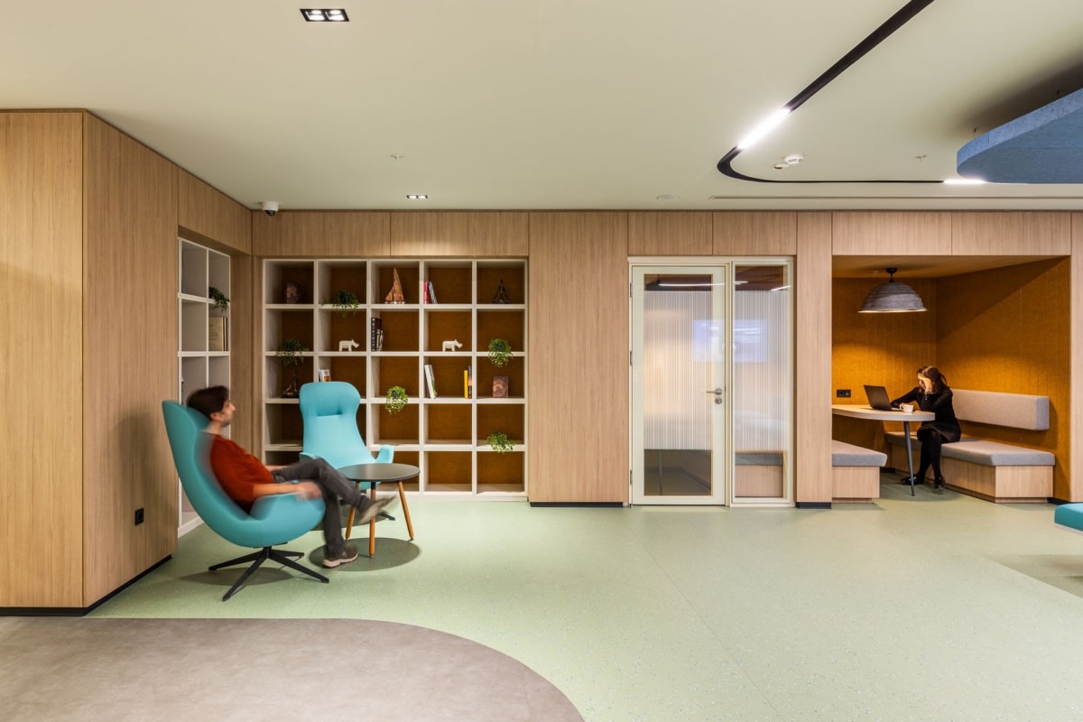 The project further embraces an activity-based working model, allowing users to choose different environments according to the nature of their tasks. Shared areas for collaboration are balanced with quiet niches and private zones for focused work and confidential meetings. A wide range of furniture types, acoustic conditions, material choices, and technological solutions supports diverse working styles, offering both introverted and extroverted modes of use.
