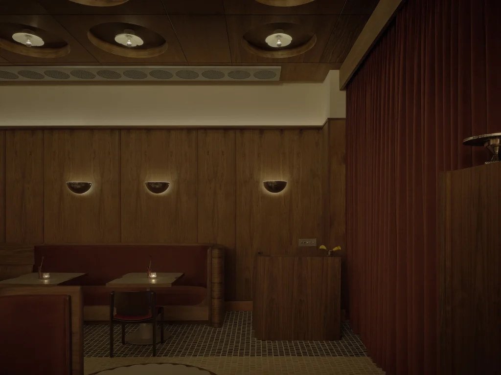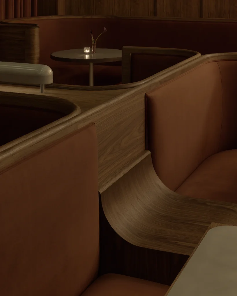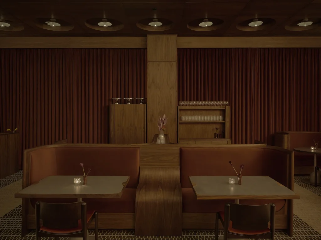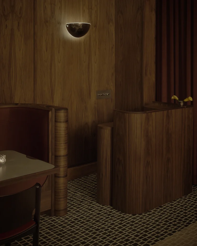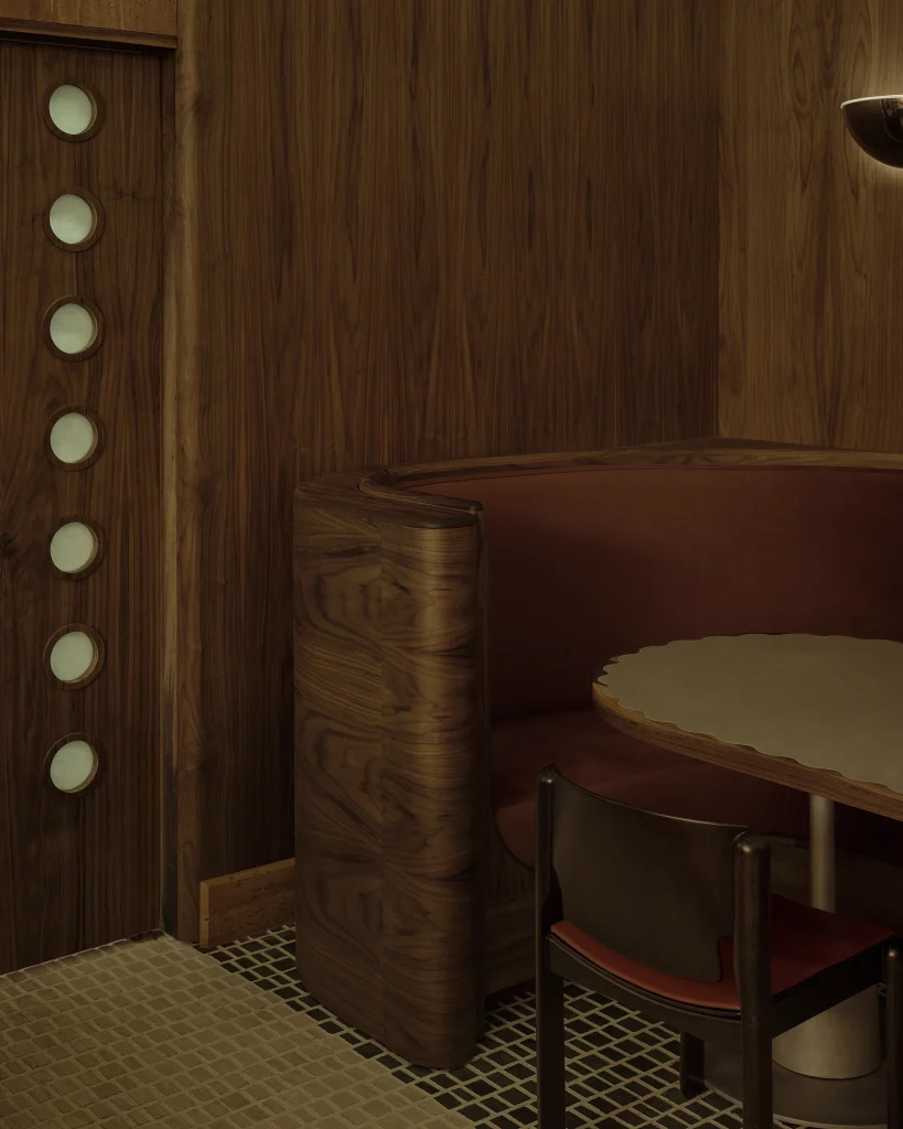 The woodwork throughout, the booths, the panelling, the quiet details that give the space its sense of weight and presence was executed by Set Acronym, a specialist firm whose craftsmanship is, by all accounts, quietly extraordinary. The curvature of those booth backs required a level of technical woodworking skill that even the owners struggle to fully describe; they simply point at the result and let the timber speak.