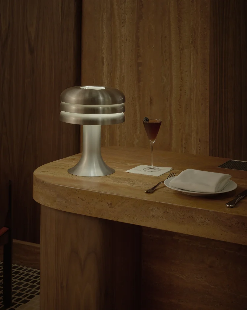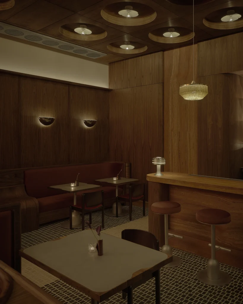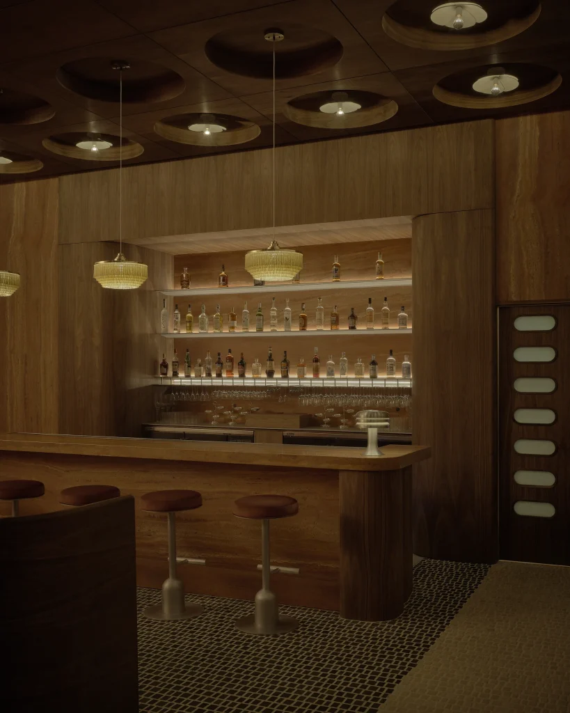 The result feels, somehow, like Carlo Mollino’s spacecraft-like Turin opera house had a slow, glamorous collision with a steamship cabin. The bar is fashioned from Iranian red travertine, its veining warm and geological against the dark American walnut that runs through the rest of the space. Burgundy banquettes hug the walls. Basalt and travertine tiles on the floor are arranged with deliberate intention — laid in a pattern calculated to guide the way you move through the room, subtly choreographing the entire evening without your realising it.