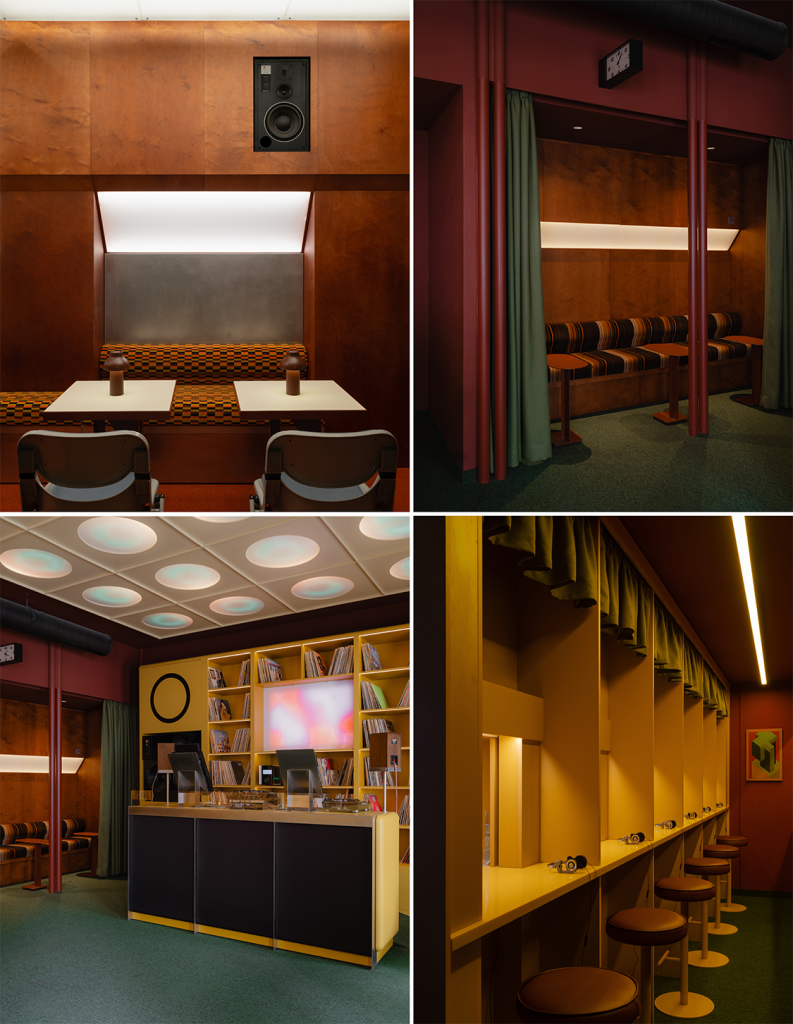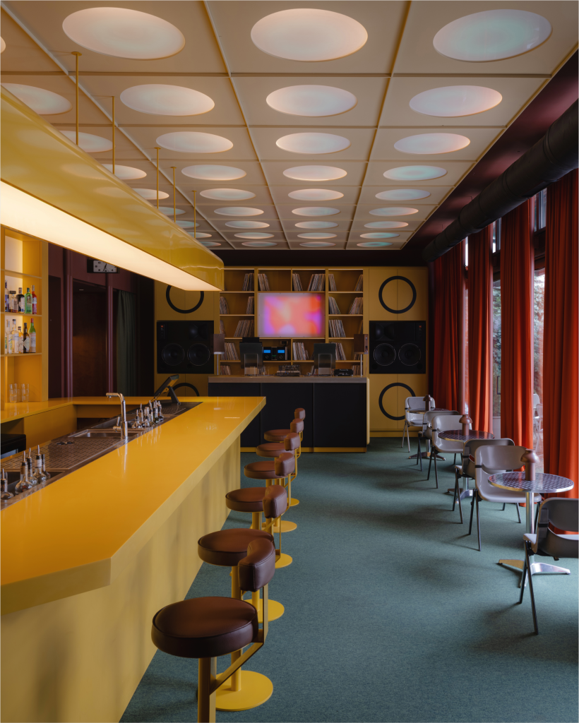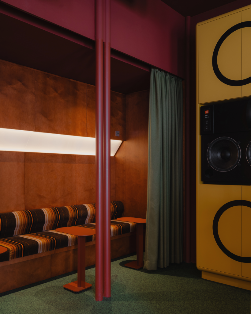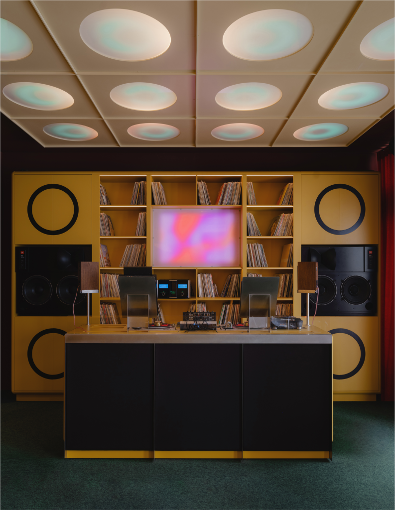 The colour accent throughout is a warm, deep yellow, simultaneously playful and rich, as if from a hallucinatory dream about the past and the future. The DJ booth evokes the K67. Above it, oval light panels flood the space with a shifting glow that sits somewhere between a spacecraft and a health sanatorium. Tucked to the left of the booth hangs a Dulton Double Face, a Japanese station clock designed for public spaces, waiting halls, offices, transit hubs. In this context, it is no accident.