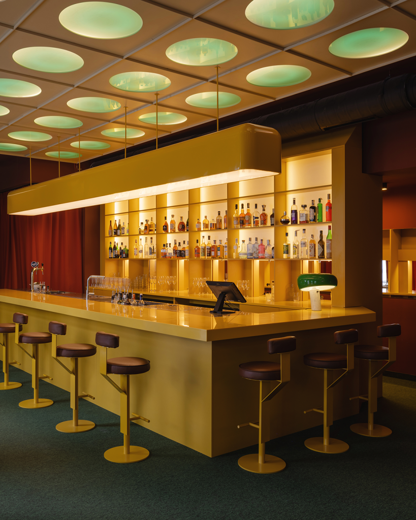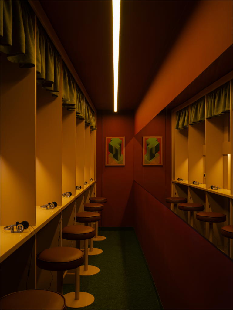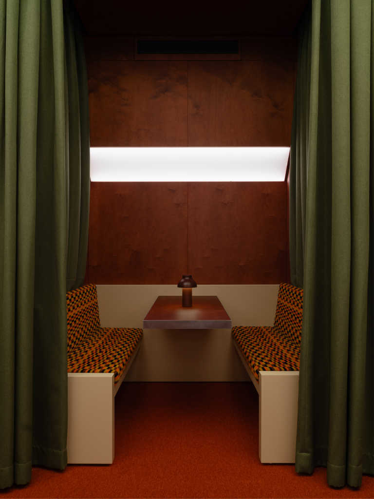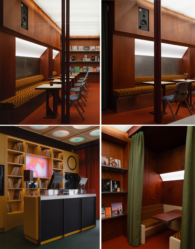 The colour accent throughout is a warm, deep yellow, simultaneously playful and rich, as if from a hallucinatory dream about the past and the future. The DJ booth evokes the K67. Above it, oval light panels flood the space with a shifting glow that sits somewhere between a spacecraft and a health sanatorium. Tucked to the left of the booth hangs a Dulton Double Face, a Japanese station clock designed for public spaces, waiting halls, offices, transit hubs. In this context, it is no accident.