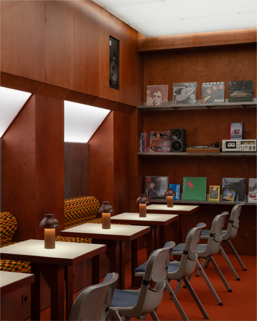 Sound was the other essential starting point. A pair of vintage JBL 4435 studio monitors and a deep vinyl collection anchor the space in the tradition of the Japanese listening bar: a room built around the ritual of hearing recorded music with full attention, on serious equipment. Supaform’s question was a good one, what would a Japanese listening bar look like in Yugoslavia, existing somewhere between the past and the future? The vinyl library here is curated with a digger’s logic. Records are not decoration. They are the point.