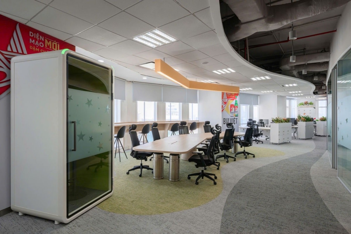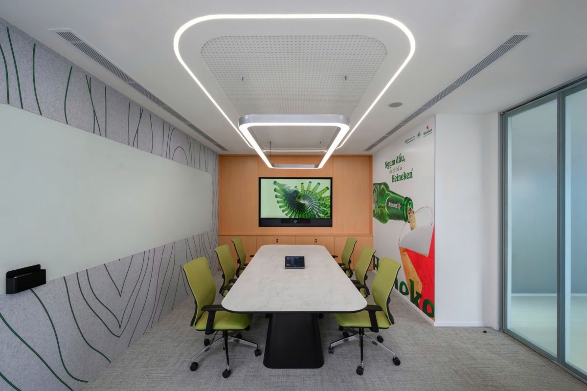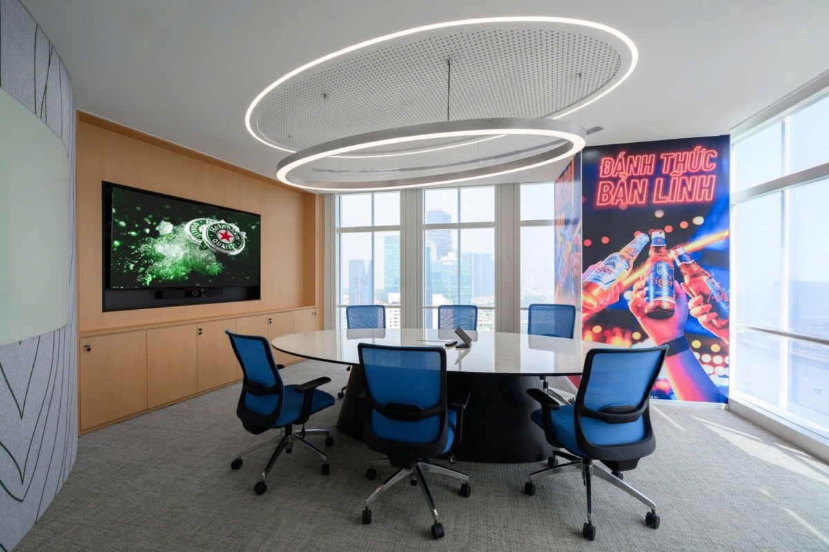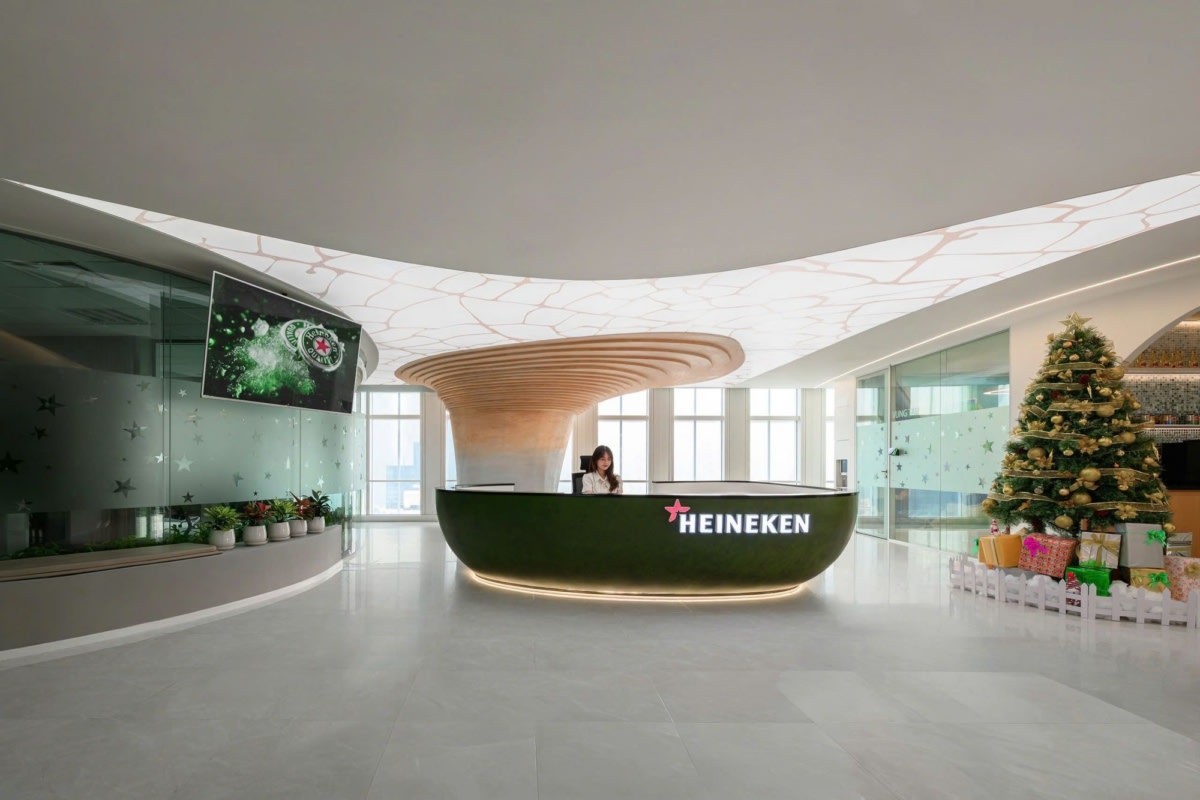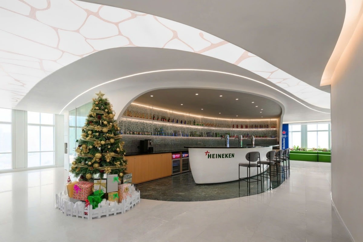 AZ Architects designed a brand-driven workplace for HEINEKEN at Vietcombank Tower in Ho Chi Minh City, Vietnam, translating the company’s over 150-year heritage into a spatial narrative that reflects both its global identity and local presence. Headquartered in Amsterdam, the Netherlands, HEINEKEN, one of the world’s leading brewing companies, distributes its portfolio of brands across more than 190 countries. The design concept takes inspiration from the birth place of the brand – the historic city of Amsterdam – particularly its iconic canals and maritime culture. This idea becomes the foundation of the office narrative, symbolizing HEINEKEN’s journey from Amsterdam through many countries before reaching Vietnam, creating a workplace that visually tells the story of the brand’s global expansion.