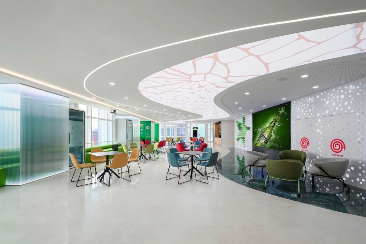 The workplace is organized around key communal zones including reception, town hall, and pantry spaces, designed as multifunctional hubs that encourage gathering, collaboration, and brand interaction. These areas invite employees and visitors not only to work and meet, but to experience HEINEKEN’s culture through social engagement and shared moments.