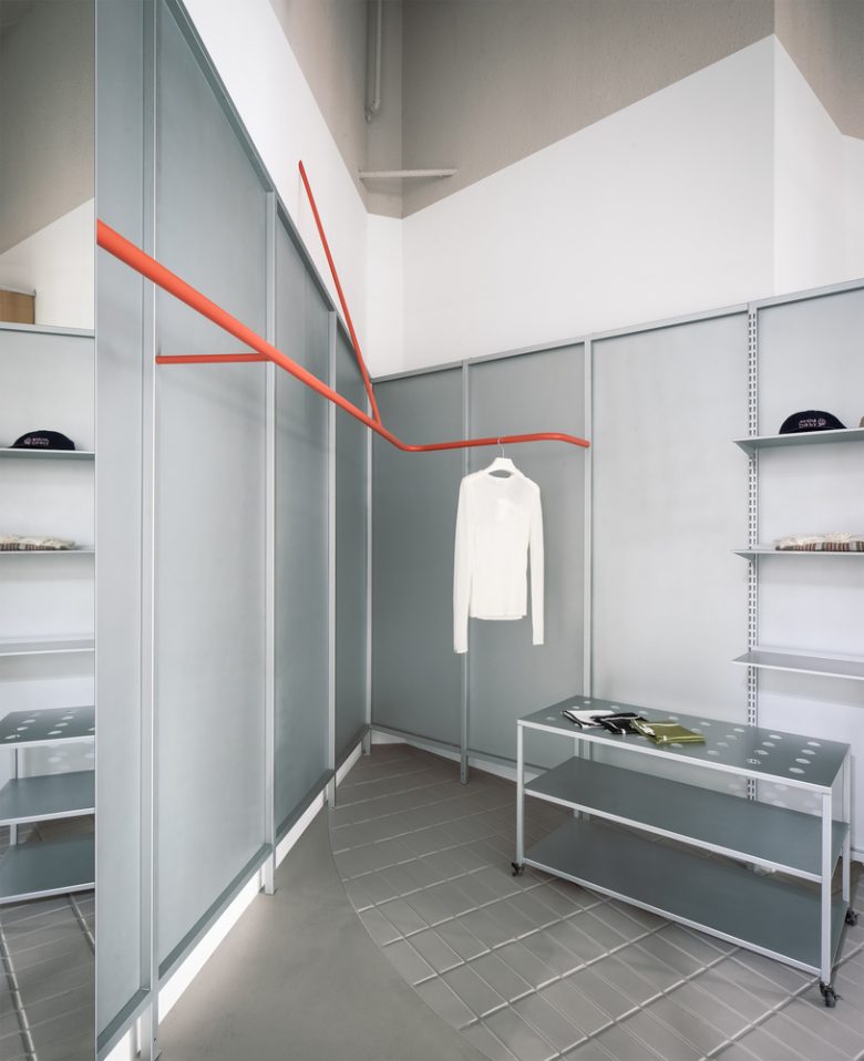 Gaps between the base and primary structure house fitting rooms and staff areas, introducing layered volumes and varied scales. This approach creates a clear, immersive retail environment where spatial clarity and functional efficiency coexist within a compact corner unit.