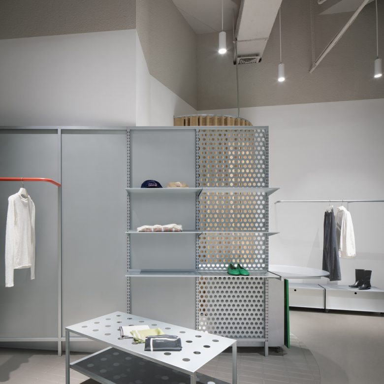 A partition system integrates display, circulation, and functional needs. Perforated panels present garments partially concealed, enhancing spatial layering and discovery. The recessed entrance with mannequin displays ensures clear wayfinding and visibility.