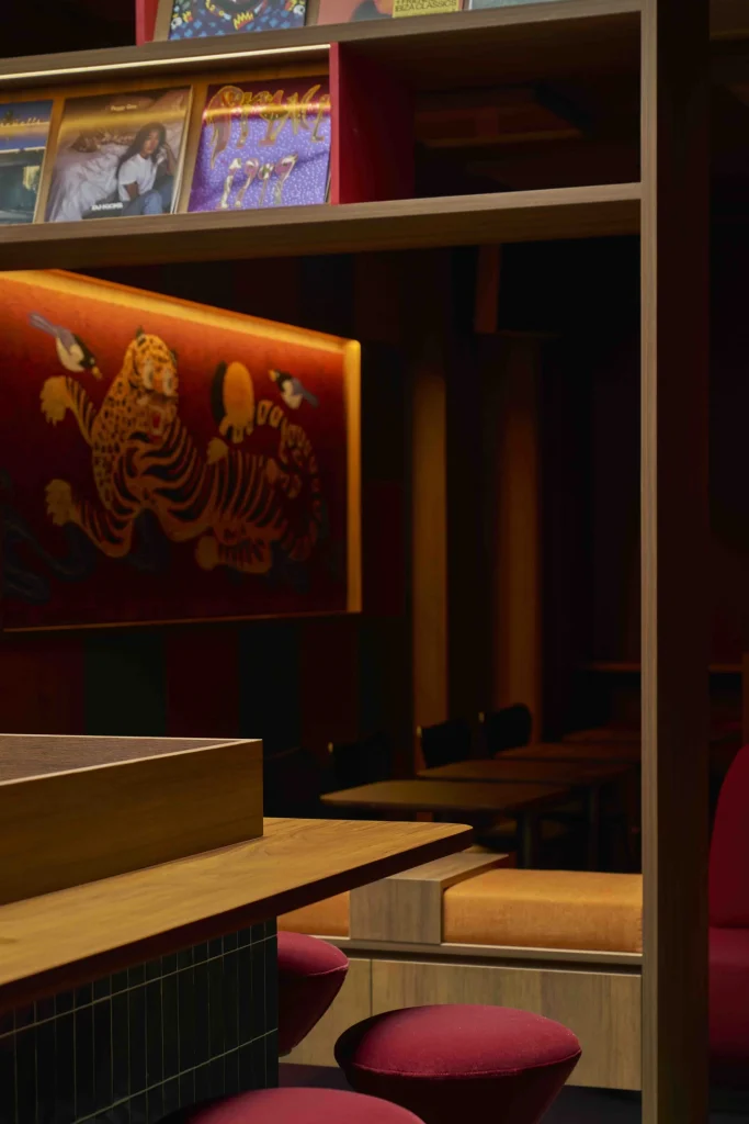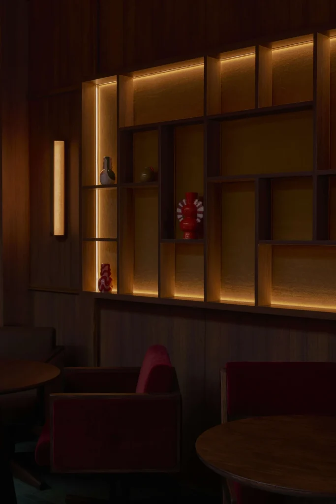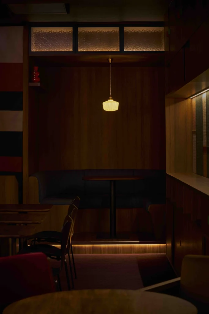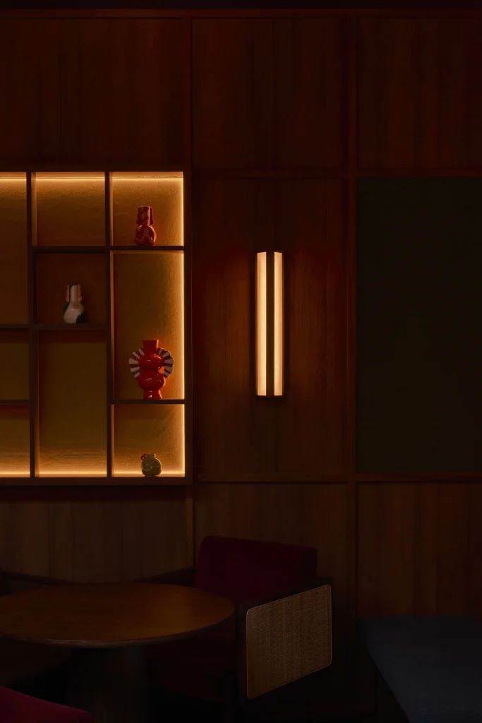 Inside the narrow shophouse, the space unfolds across four distinct zones, each calibrated to the social behaviour it supports. Timber-clad surfaces and warm lighting invite lingering conversations, while a tactile mix of soft beiges, earthy terracotta, ochres and deep reds softly references Korea’s obangsaek colour system and traditional dancheong palettes. Custom joinery and bespoke lighting, paired with careful acoustics, keep the interior lived-in and inviting rather than staged.
