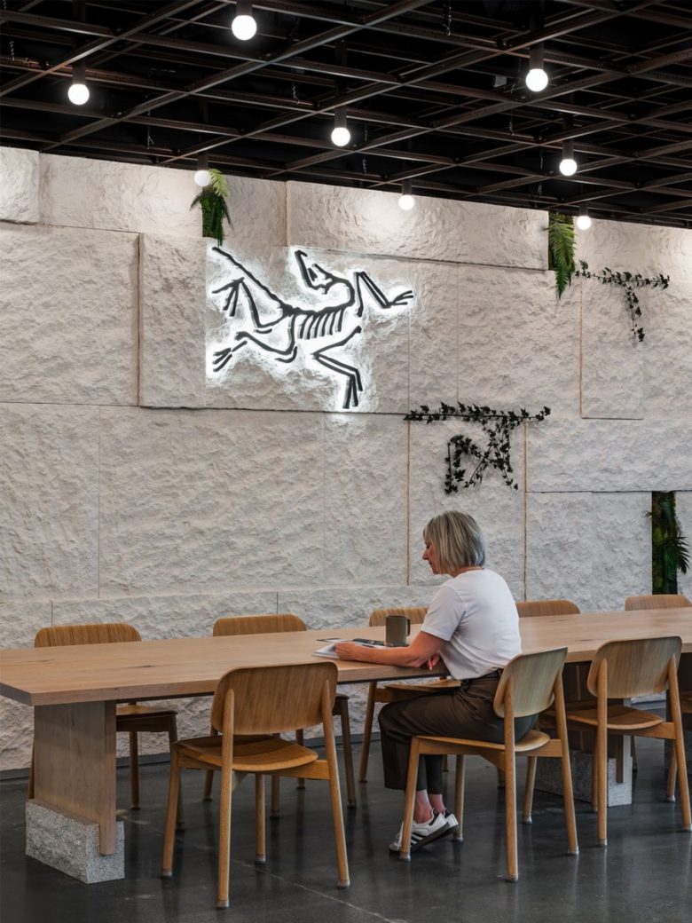 Beside the main space, the café blurs the line between workplace and everyday life. Part café, part gathering place, it’s where people meet before a run, debrief after a workshop or share a coffee at the day’s end. It’s a casual, intentional and welcoming space rooted in the human-centred culture and West Coast spirit of Arc’teryx.
