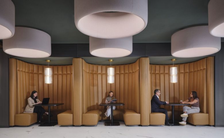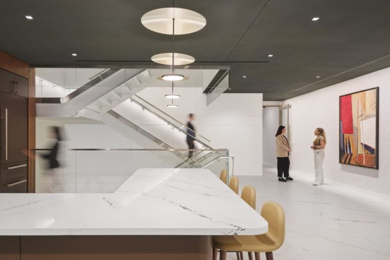 The new office spans three floors and is centered around a hospitality-first approach, featuring a range of top-tier amenities that offer moments to restore and re-energize, including a speakeasy-inspired “Club Café,” which features a fireplace and a variety of seating options to comfortably accommodate staff working alone or together. Warm wood tones and tactile finishes balance the sunlit space, creating an inviting community atmosphere. Local artists and plants displayed in the office create an emotional connection to Chicago, bringing the landscape and culture inside the perimeter of the office environment.
