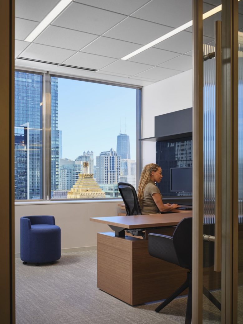 Culturally, the “right to light” shaped the overall design approach, ensuring all employees have access to natural daylight and panoramic views of the Chicago skyline and Lake Michigan from their dedicated workspace. Perimeter attorney offices, all equal in size, feature glass-fronted facades letting natural light flood the interior of the space.